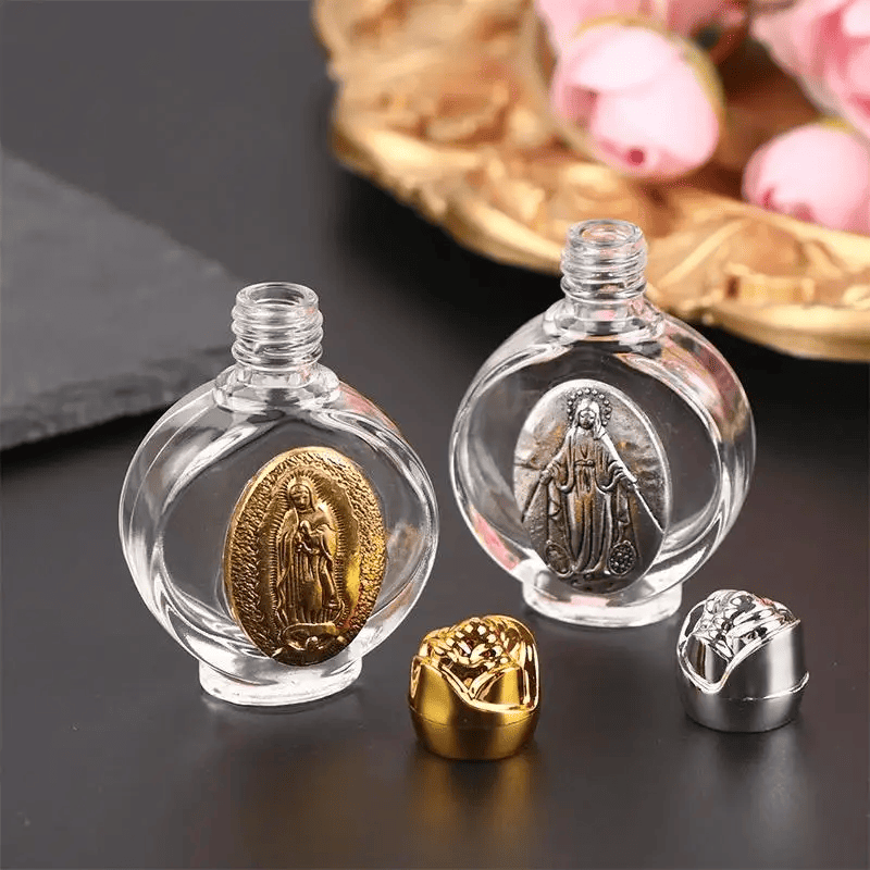 This delicate bottle combines elegance and spirituality in a unique devotional piece. Made of clear glass, it features a rose-shaped lid, a symbol of purity and divine grace. Its design offers security and an airtight seal to protect its sacred contents.