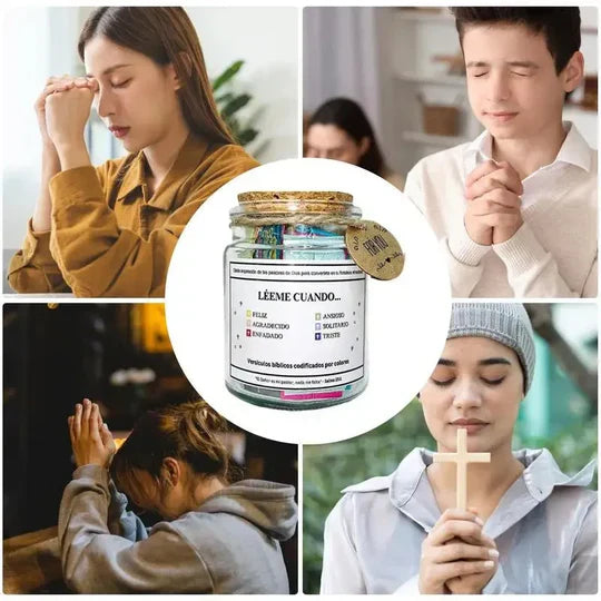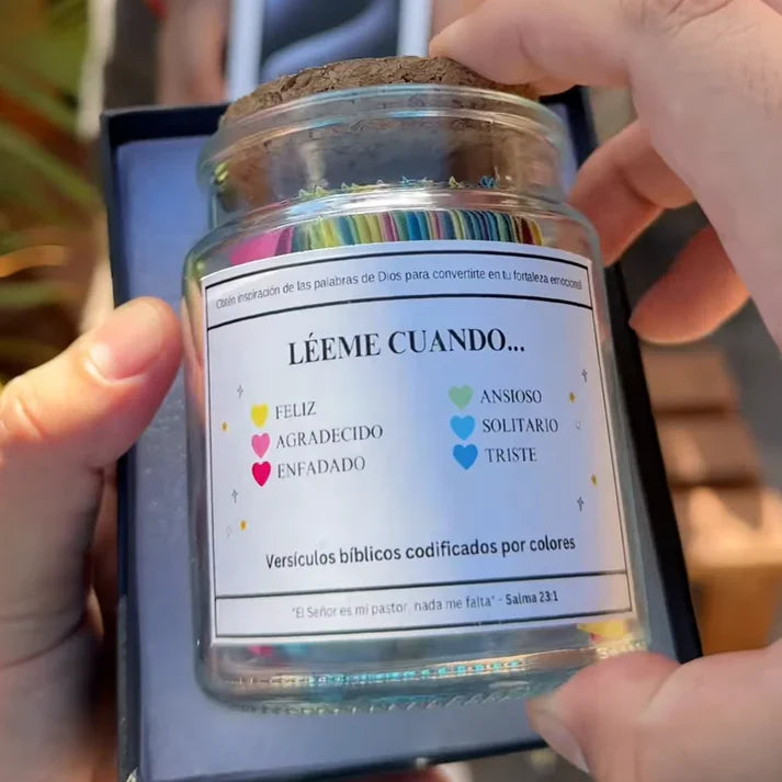 Discover the power of God's Word in your daily life. This jar contains 90 carefully selected Bible verses to bring you peace, hope, and gratitude in every moment. Its reusable glass design not only decorates, but also holds messages that uplift your spirit and fill your life with light. 🌿