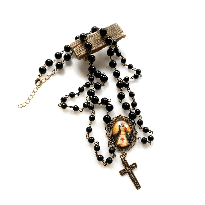The acrylic beads, measuring 6 mm and 8 mm, add a subtle shine that symbolizes purity and divine protection. The adjustable chain design for comfort ensures a perfect fit, while the center cross represents the sacrifice and the love of Christ.