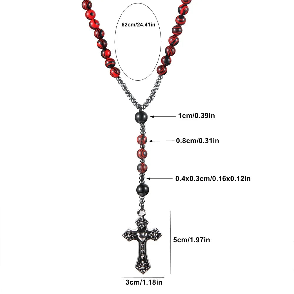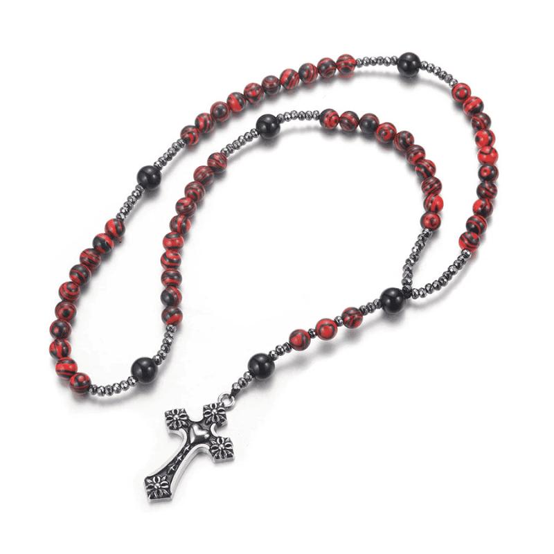 This elegant rosary necklace, designed for men and women, combines 8mm red stones with black veins that represent passion and spiritual energy.