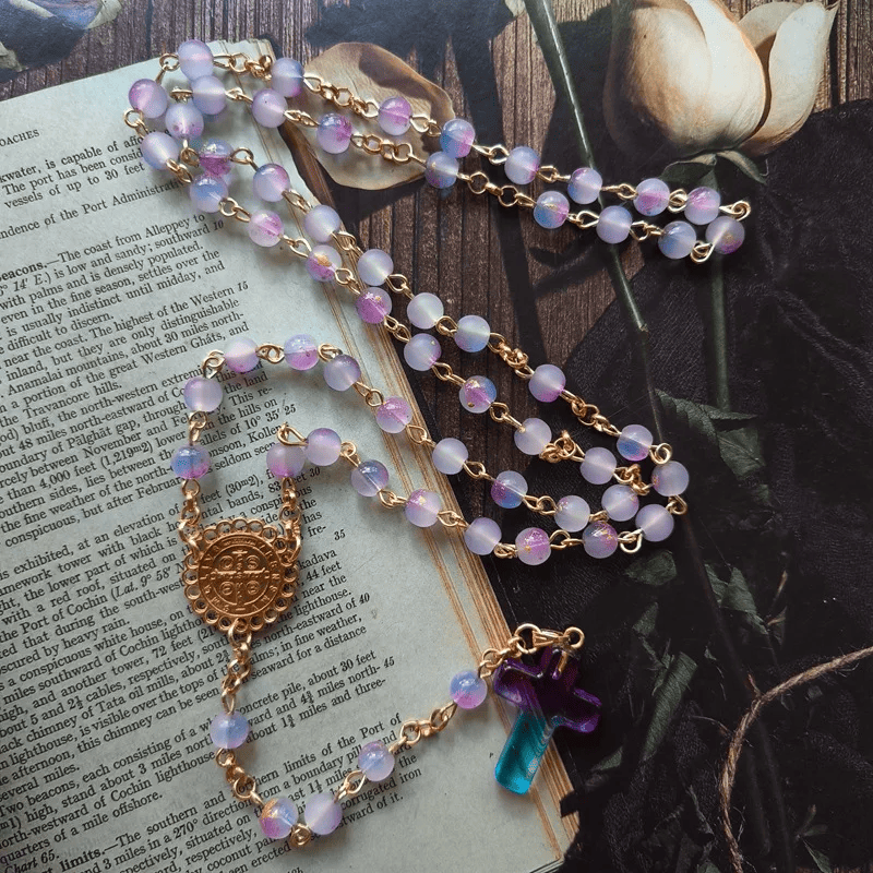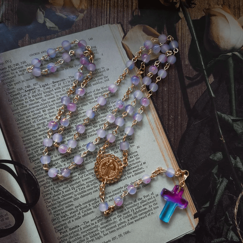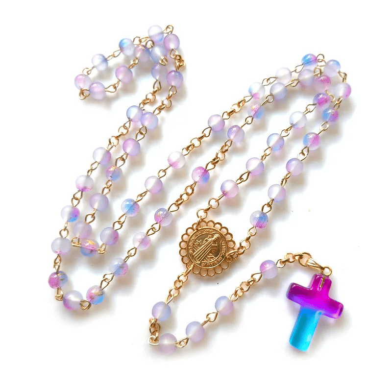 Designed especially for women of deep spirituality, this rosary combines the delicacy of crystal with the strength of metal, reflecting the beauty of daily devotion. The 6mm glass beads shine softly, while the metallic cross adds a sacred and timeless touch.