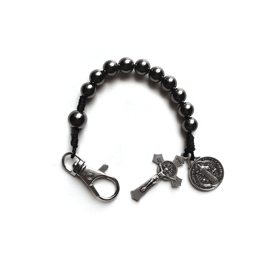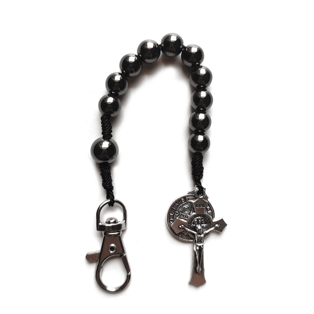 Carry a powerful symbol of faith and protection with this pocket rosary designed with hematite beads and the Saint Benedict medal. Ideal for everyday life, the car or moments of prayer, this accessory combines religious tradition and modern style in a single piece. Its compact design makes it perfect as a personal amulet or spiritual gift for loved ones.