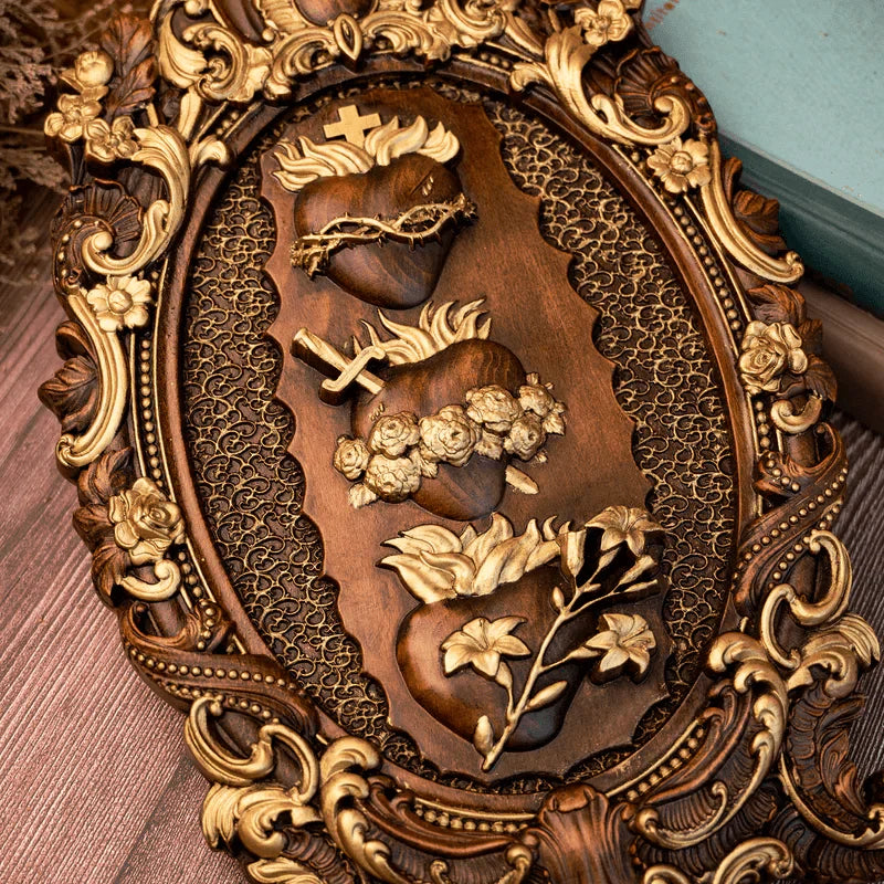 This wood sculpture represents the Sacred Heart of Jesus, the Immaculate Heart of Mary, and the Chaste Heart of Saint Joseph.