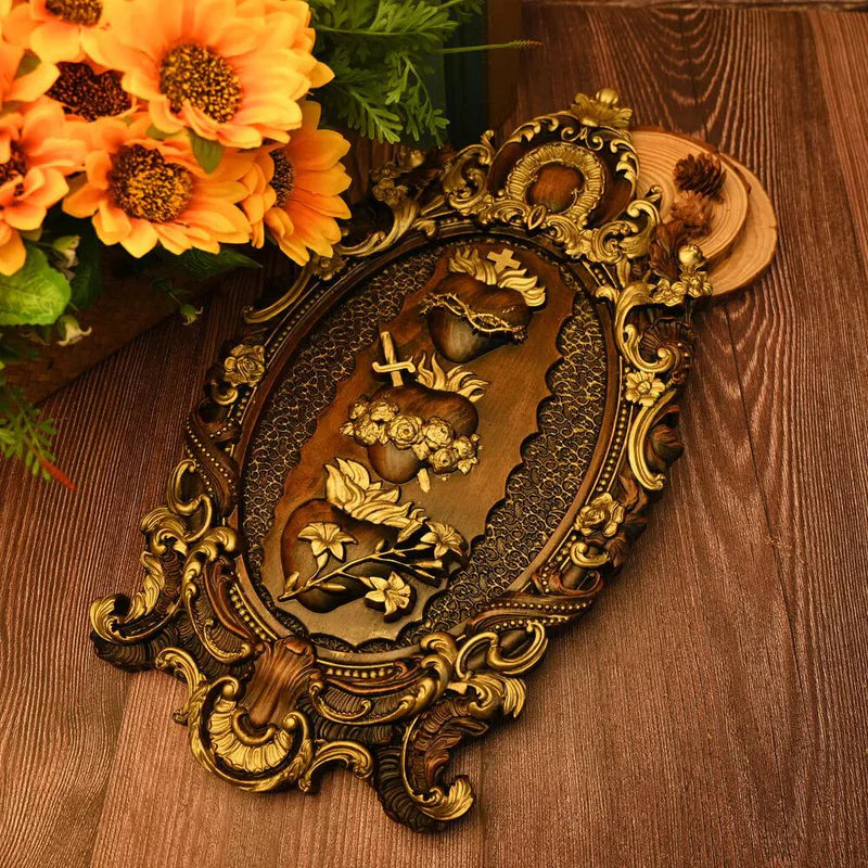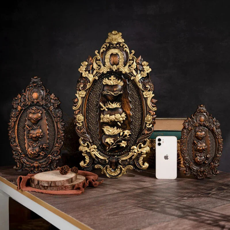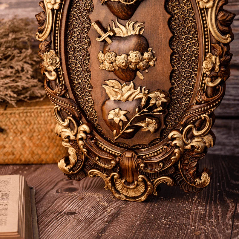 This exquisite wood-carved work of art is a wonderful gift for a loved one (or yourself) who has a special devotion to the Holy Family, and in particular to its three Sacred Hearts: the Sacred Heart of Jesus, the Heart of the Immaculate Conception, and the Chaste Heart of Saint Joseph.